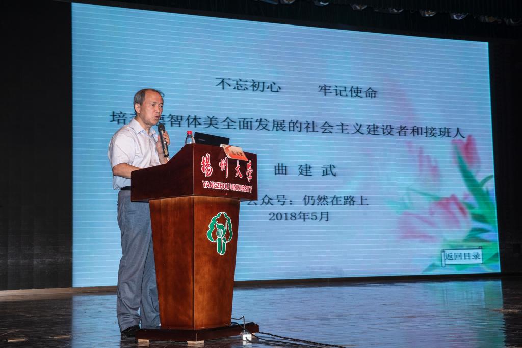 曲建武教授以《不忘初心 牢记使命,培养德智体美全面发展的社会主义建设者和接班人》为题,讲述了自己放弃厅长职位,回到校园做一名普通的辅导员陪伴、培养众多学生成长成才的感人故事,在场与会人员深受鼓舞,反响热烈。