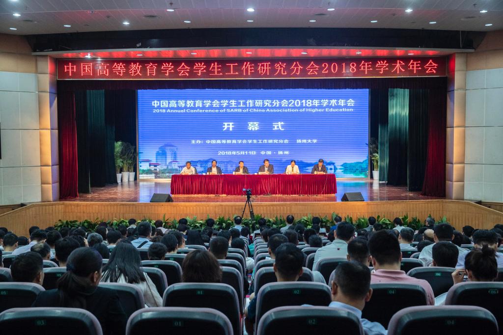 5月11日上午,中国高等教育学会学生工作研究分会2018年学术年会开幕式在扬州大学隆重召开。中国高等教育学会学生工作研究分会理事长、中北大学党委书记李忠人,江苏省教育厅党组成员、副厅长苏春海,扬州大学党委书记姚冠新,中国高等教育学会学术部主任高晓杰,中国高等教育学会学生工作研究分会副理事长兼秘书长、中北大学党委副书记薛智,中国高等教育学会学生工作研究分会副理事长、扬州大学党委副书记叶柏森等出席开幕式。此外,来自全国26个省市自治区136所高校的近400名领导、专家、学者和一线学生工作者参与会议本次年会以“新时代高校学生工作的新探索新实践”为主题,旨在深入学习宣传贯彻党的十九大精神,全面落实全国高校思想政治工作会议精神,更好地推动新时代高校学生工作科学化管理、精准化服务、创新性发展,深入研究符合新时代要求的学生培养新理论,探讨学生管理新方法,创新学生教育新模式,提升高校学生工作效能,提高高校人才培养能力,引导学生健康成长和全面发展,实现全员育人、全过程育人、全方位育人。